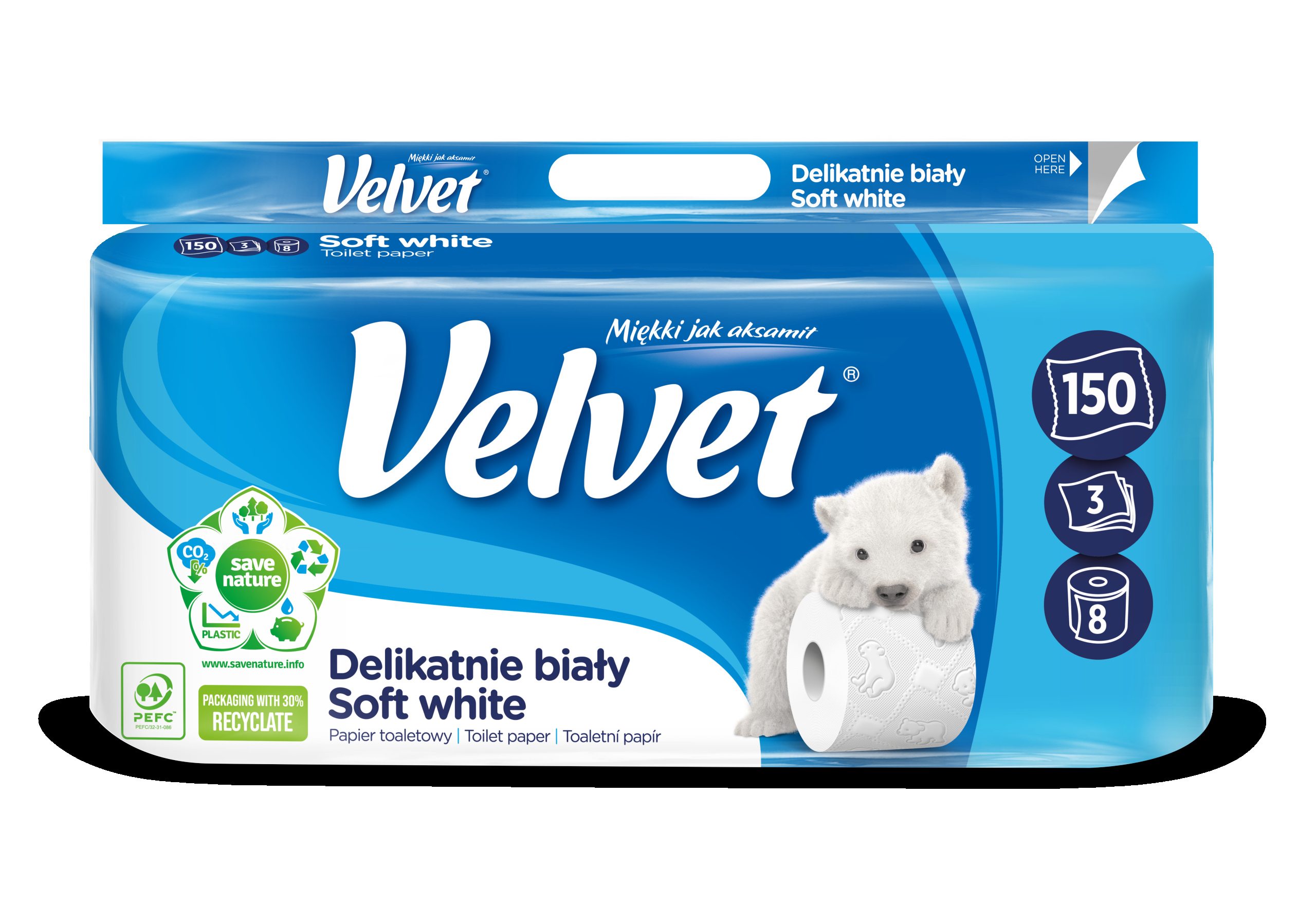 ✅ Papier toaletowy Velvet Delikatnie Biały to trzy warstwy miękkiej bibułki połączonej delikatnym, tłoczonym wzorem z postaciami niedźwiadków.