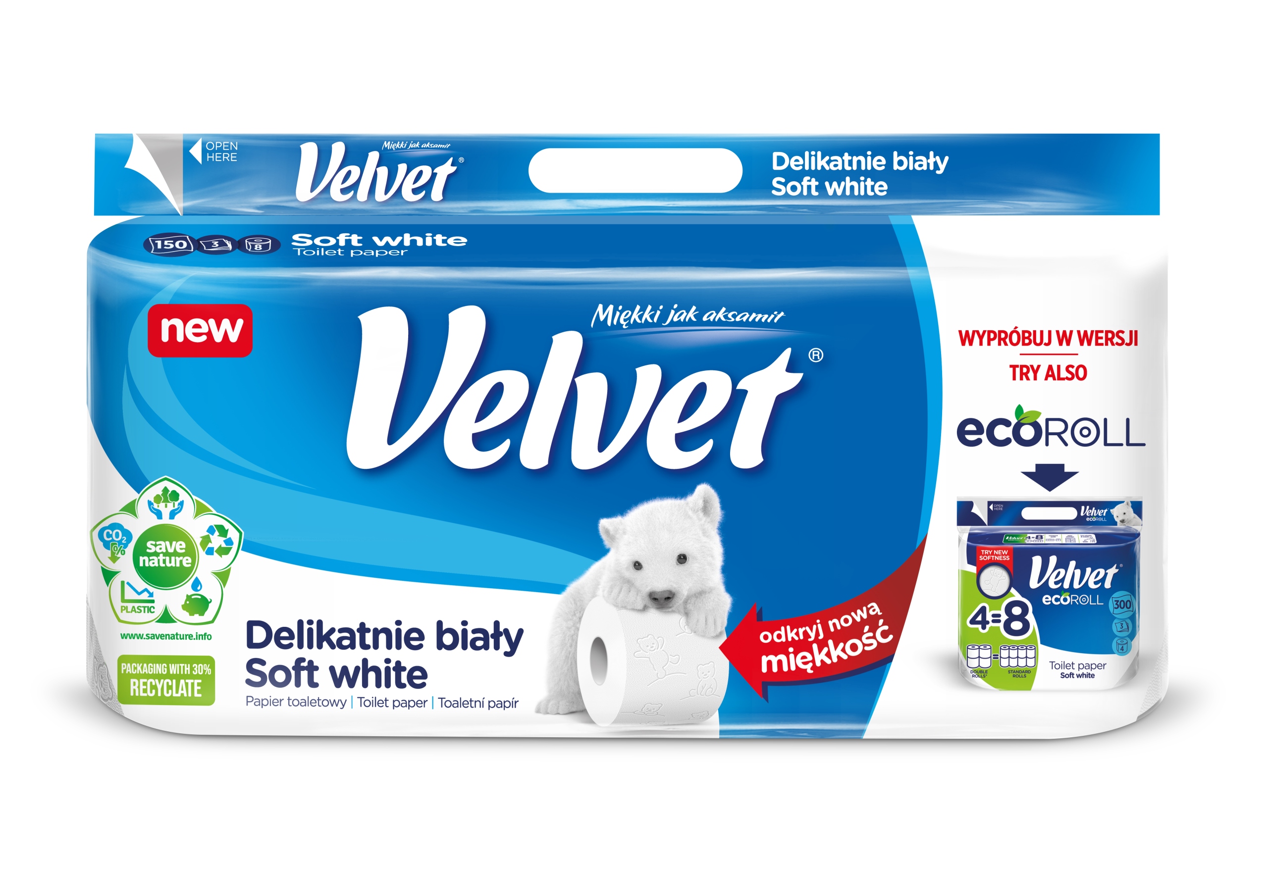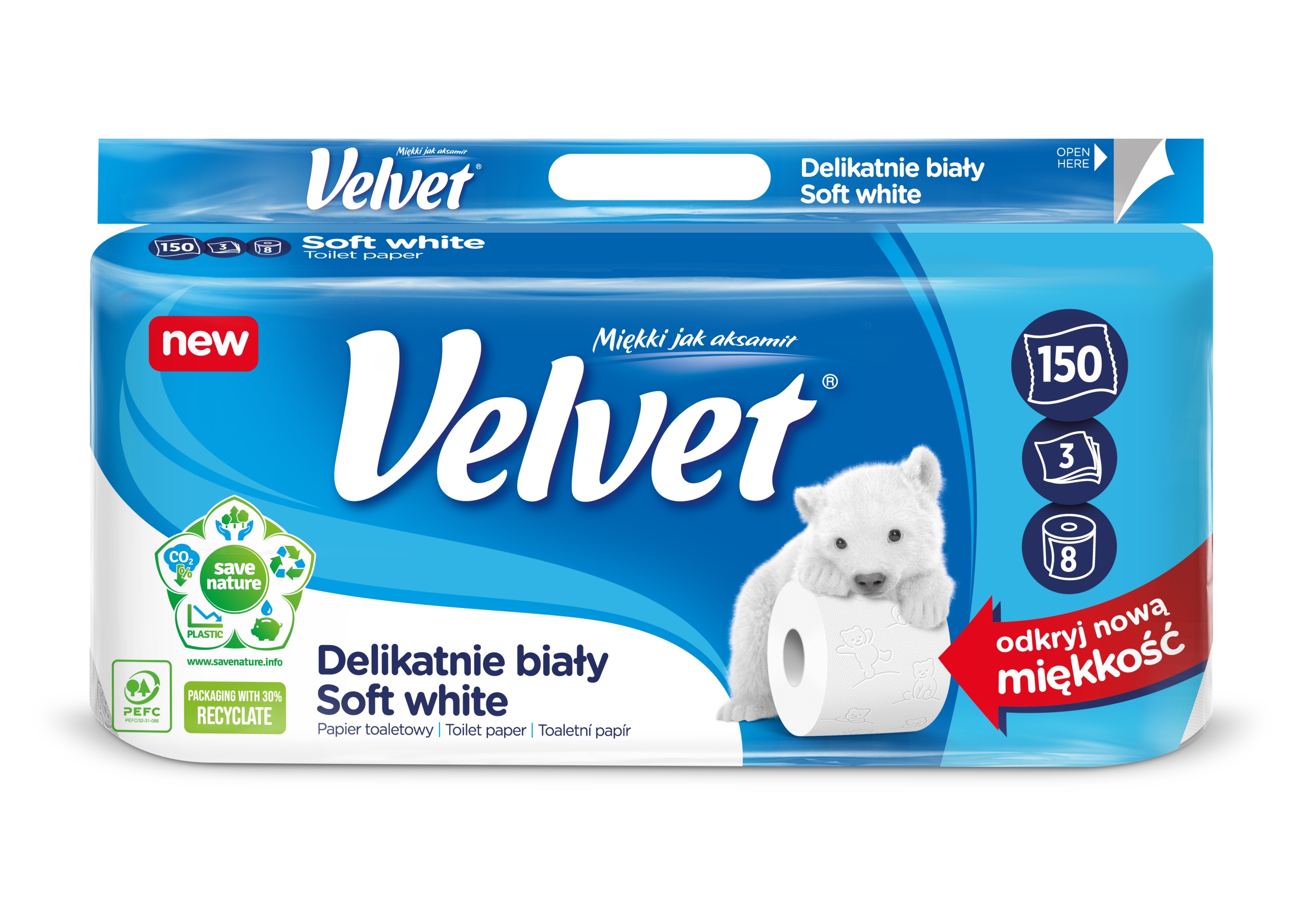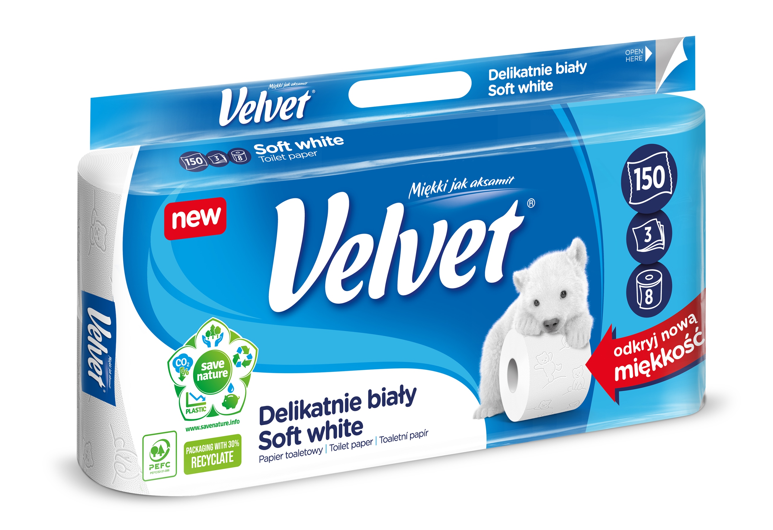 ✅ Papier toaletowy Velvet Delikatnie Biały to trzy warstwy miękkiej bibułki połączonej delikatnym, tłoczonym wzorem z postaciami niedźwiadków.