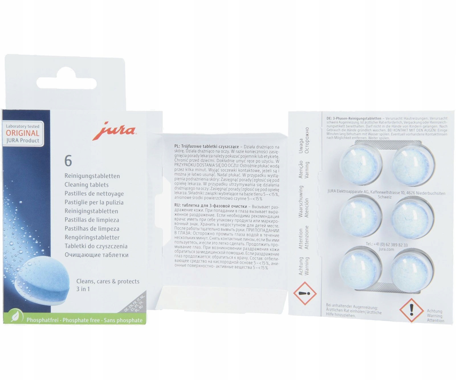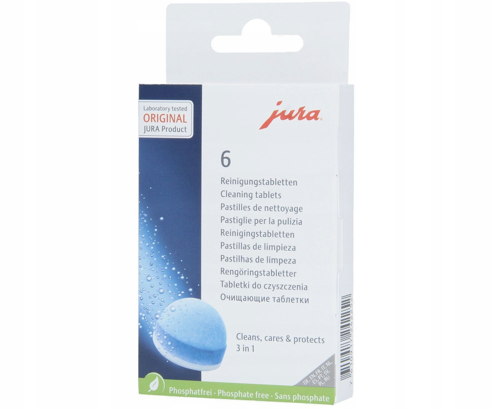 Silna świadomość ekologiczna ma w JURA równie długą tradycję, jak zrównoważone obchodzenie się z zasobami i energią. Dlatego JURA w swoich oryginalnych tabletkach czyszczących stosuje wyłącznie skład niezawierający fosforanów. Zoptymalizowana formuła gwarantuje higienę automatycznego ekspresu do kawy posiadającą certyfikat TÜV i jednocześnie dba o środowisko.