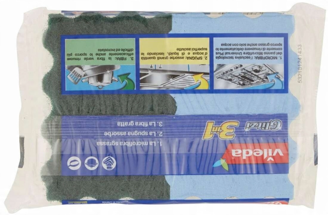 Glitzi 3 in1 to innowacyjna gąbka ścierna oferująca 3 funkcje w jednym produkcie: zielone włókno czyści tłuszcz i uporczywy brud, odkamienia, żółta gąbka wchłania brud, a niebieska z mikrofibry – pochłania więcej tłuszczu.