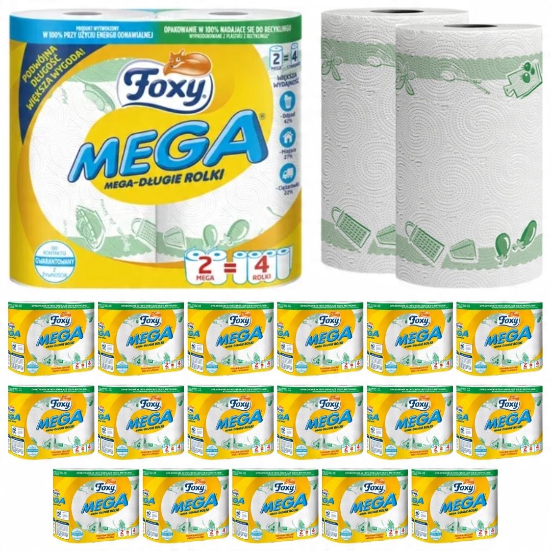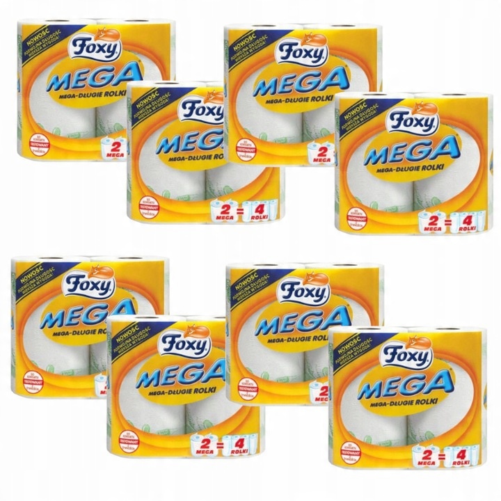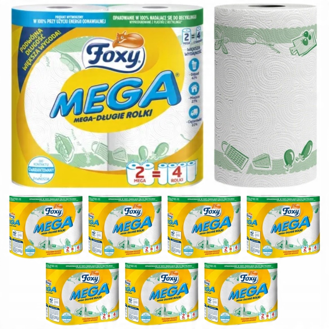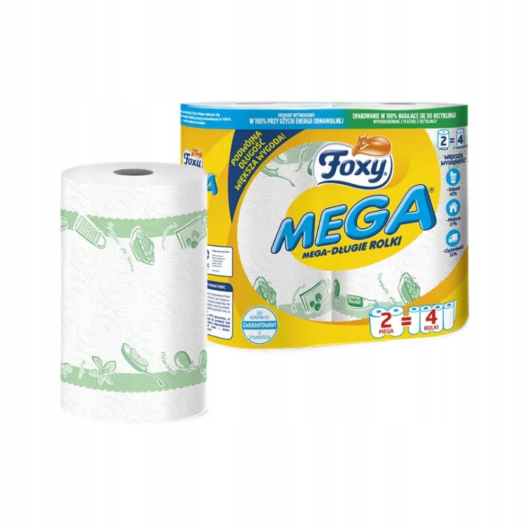 Ręczniki kuchenne Foxy Mega to wygoda i funkcjonalność. Każdy rolka posiada 90 listków, a specjalnie zaprojektowana struktura papieru powoduje, że woda wchłaniana jest równomiernie. Ręcznik Mega Foxy jest produktem uniwersalnym, może być stosowany także w kuchni. Jest bezpieczny w kontakcie z żywnością co zostało przetestowane.Produkowany jest z najlepszych gatunków czystej celulozy, a zastosowana technologia sprawia, że ręcznik Foxy Mega jest zarówno chłonny jak i wytrzymały.