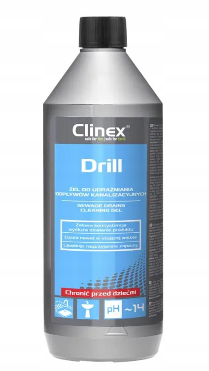 Clinex Drill to niezawodny żel do udrażniania rur, który wyróżnia się na tle innych produktów dzięki wygodnej formie żelowej. Pozwala ona na dokładne osadzenie się preparatu na ściankach rur. To przedłuża proces działania i zapewnia głębokie czyszczenie. Zatkany odpływ? Z naszym preparatem to już nie problem!