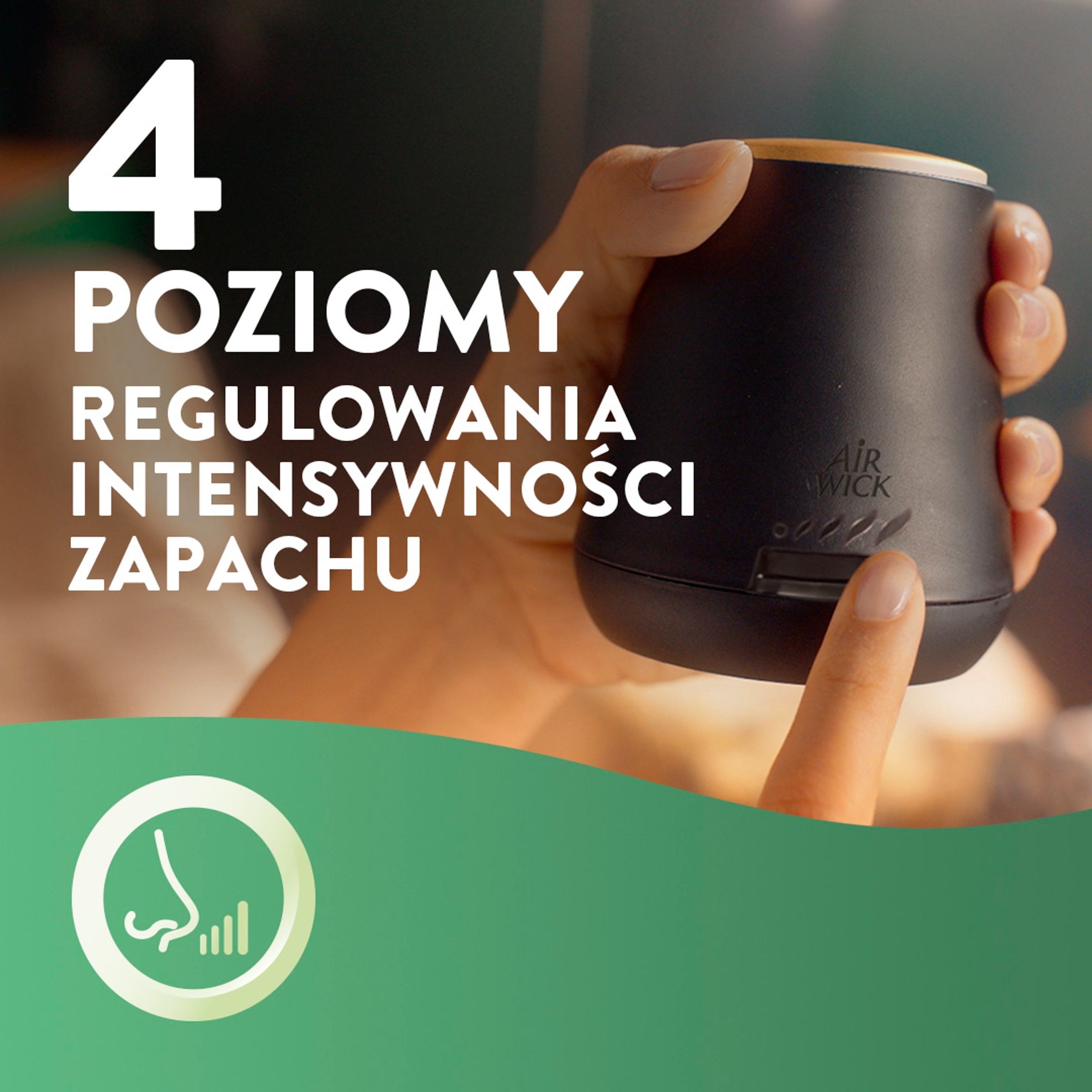 - Włącz urządzenie, przesuwając przycisk (zapali się niebieska lampka). Ustaw poziom intensywności zapachu.