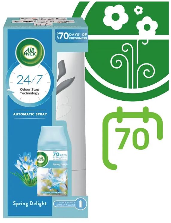 - Zestaw kompletny : Zawiera urządzenie, wkład o zapachu wiosennej świeżości 250ml oraz baterie.