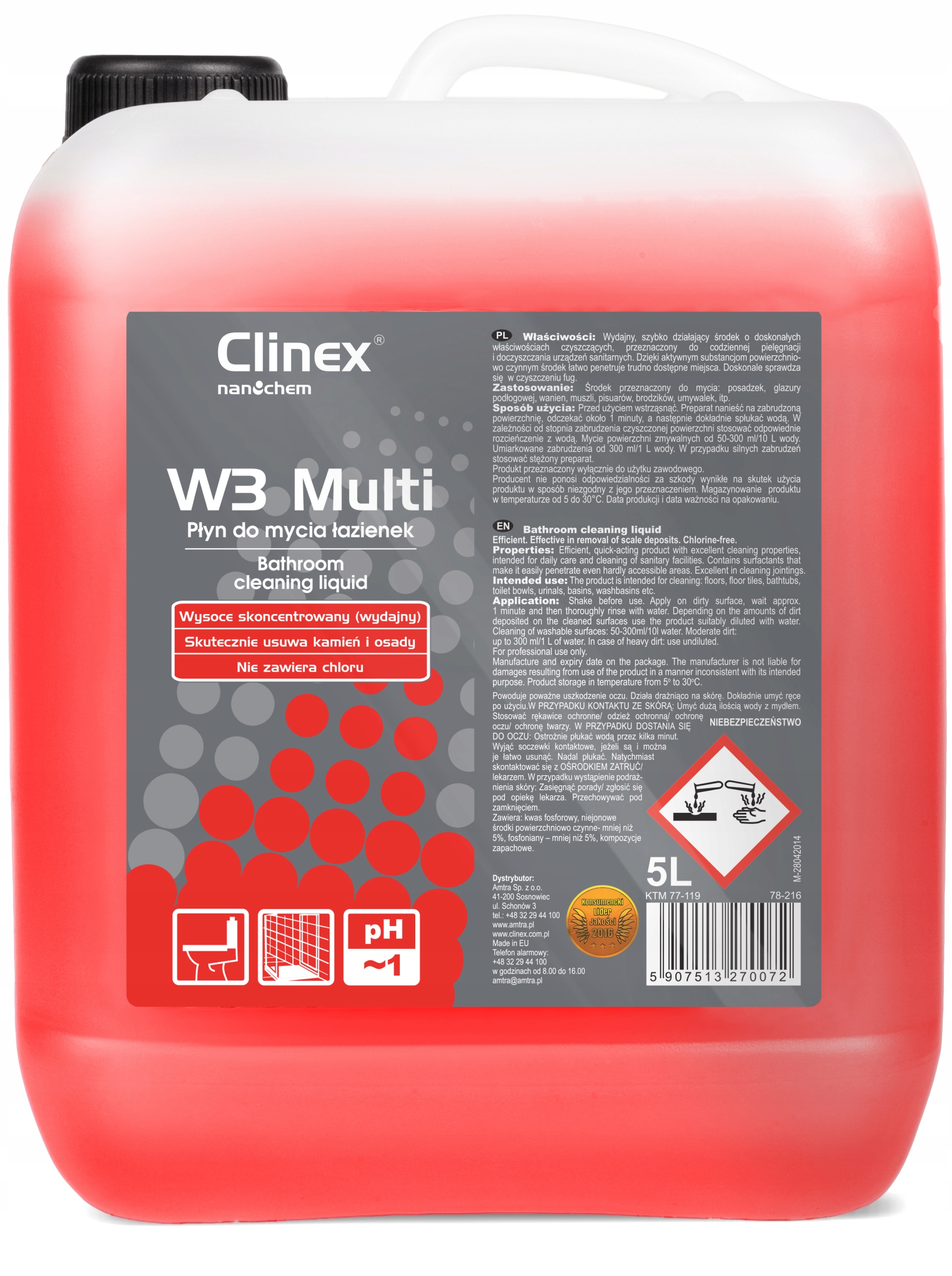 Doskonały płyn do mycia łazienek urządzeń sanitarnych fug CLINEX W3 Multi 5L