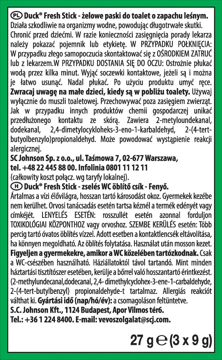 Paski DUCK to środek odświeżający do toalety w wygodnej formie żelowych pasków aplikowanych bezpośrednio na powierzchnie muszli klozetowej. Nowoczesna formuła produktu pomaga utrzymać wnętrze toalety higienicznie czyste, zapobiega tworzeniu się nieestetycznych osadów oraz przebarwień i pozostawia przyjemny zapach lasu.