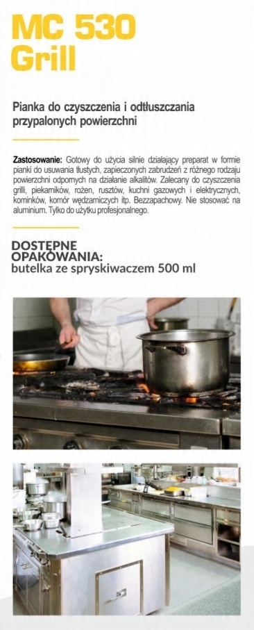 Zastosowanie: Gotowy do użycia silnie działający preparat w formie pianki do usuwania tłustych, zapieczonych zabrudzeń z różnego rodzaju powierzchni odpornych na działanie alkaliów. Zalecany do czyszczenia grilli, piekarników, rożen, rusztów, kuchni gazowych i elektrycznych, kominków, komór wędzarniczych itp. Bezzapachowy. Nie stosować na aluminium. Tylko do użytku profesjonalnego.