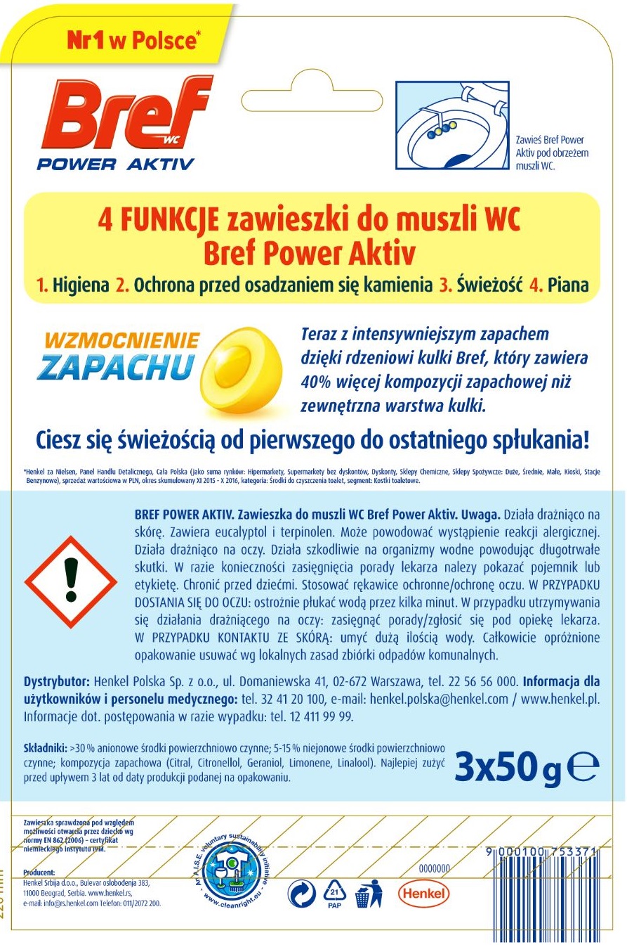Strona główna » Sklep » Zawieszki Bref do WC Power Aktiv 3x50g cytryna
