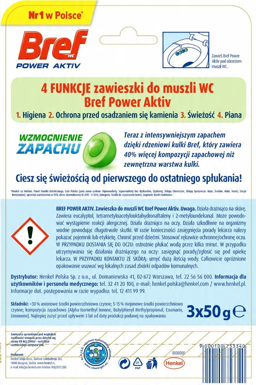 Sposób użycia : Zawieś Bref Power Aktiv pod obrzeżem muszli toaletowej.