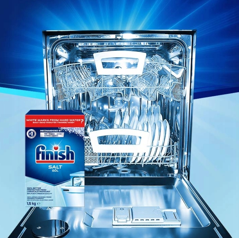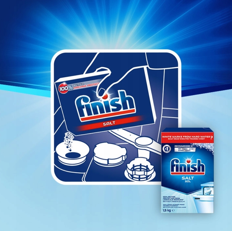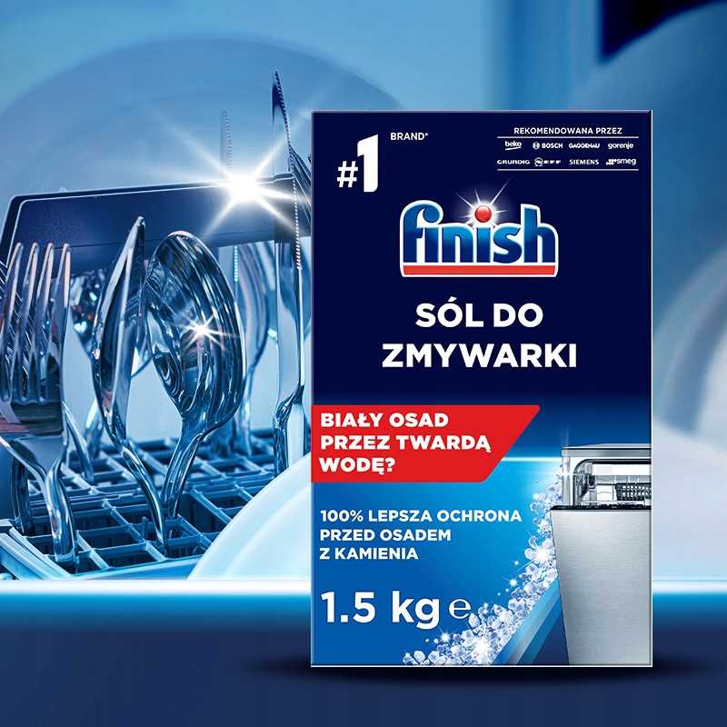 Sól ochronna do zmywarki Finish to niezbędny element do osiągnięcia idealnej czystości Twoich naczyń. Nie tylko chroni urządzenie przed osadami z kamienia i eliminuje zacieki na naczyniach, ale również zmiękcza wodę i poprawia działanie zmywarki. Dociera do ukrytych miejsc, np. ramion spryskiwaczy i rur. Wspomaga działanie detergentu, by naczynia były jeszcze czystsze i bardziej błyszczące. Sól Finish rekomendowana jest przez czołowych producentów zmywarek.
