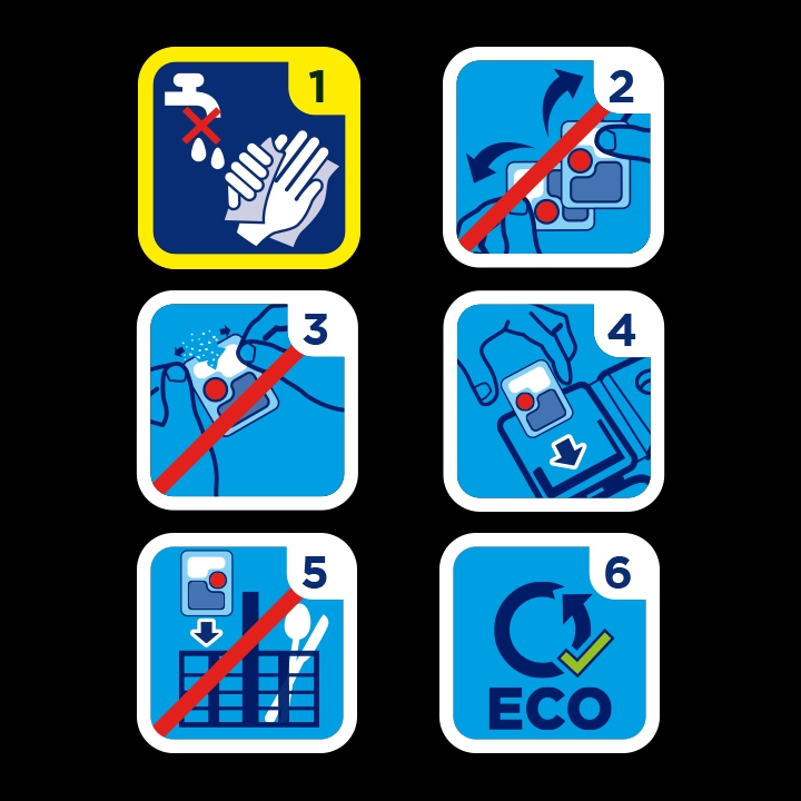 - Do każdego zmywania umieść jedną kapsułkę w SUCHYM dozowniku.