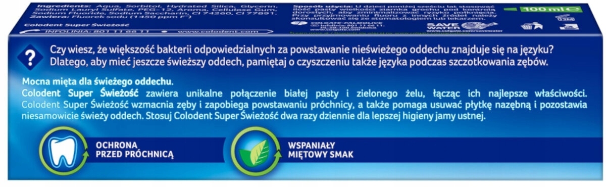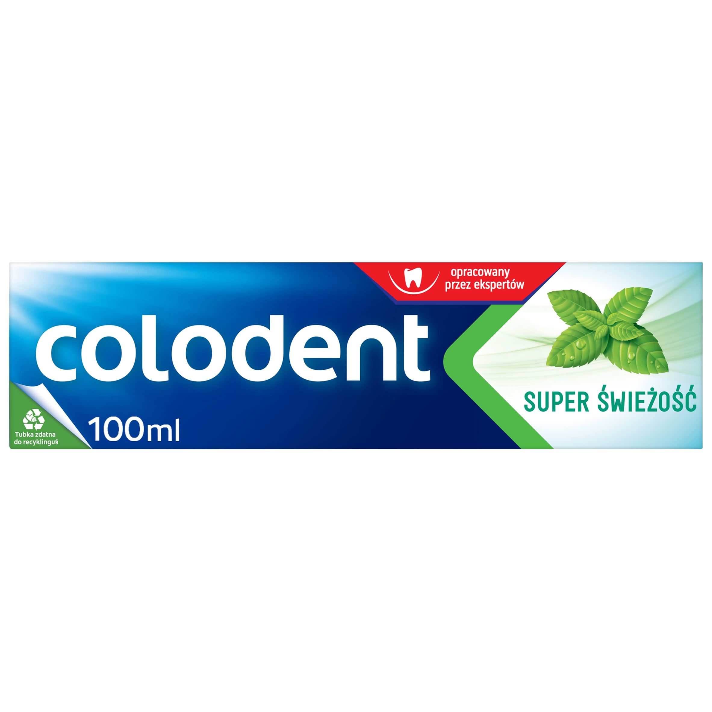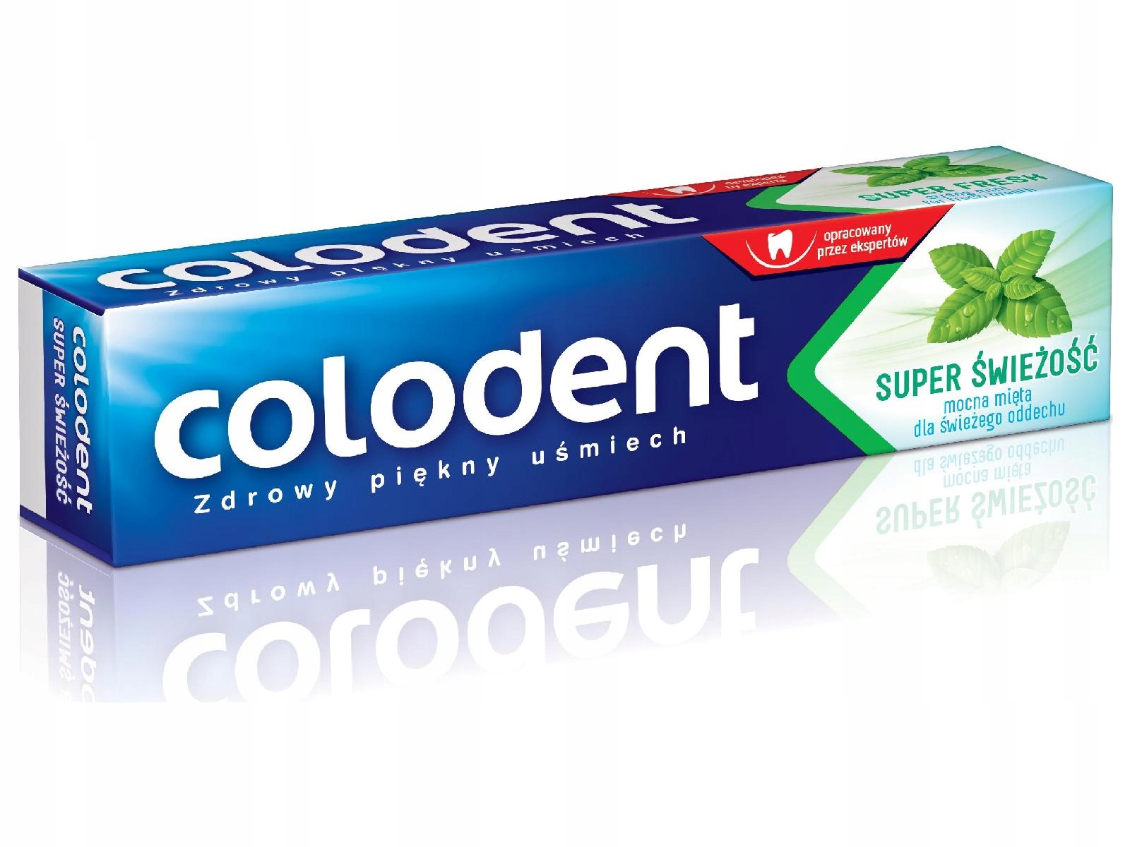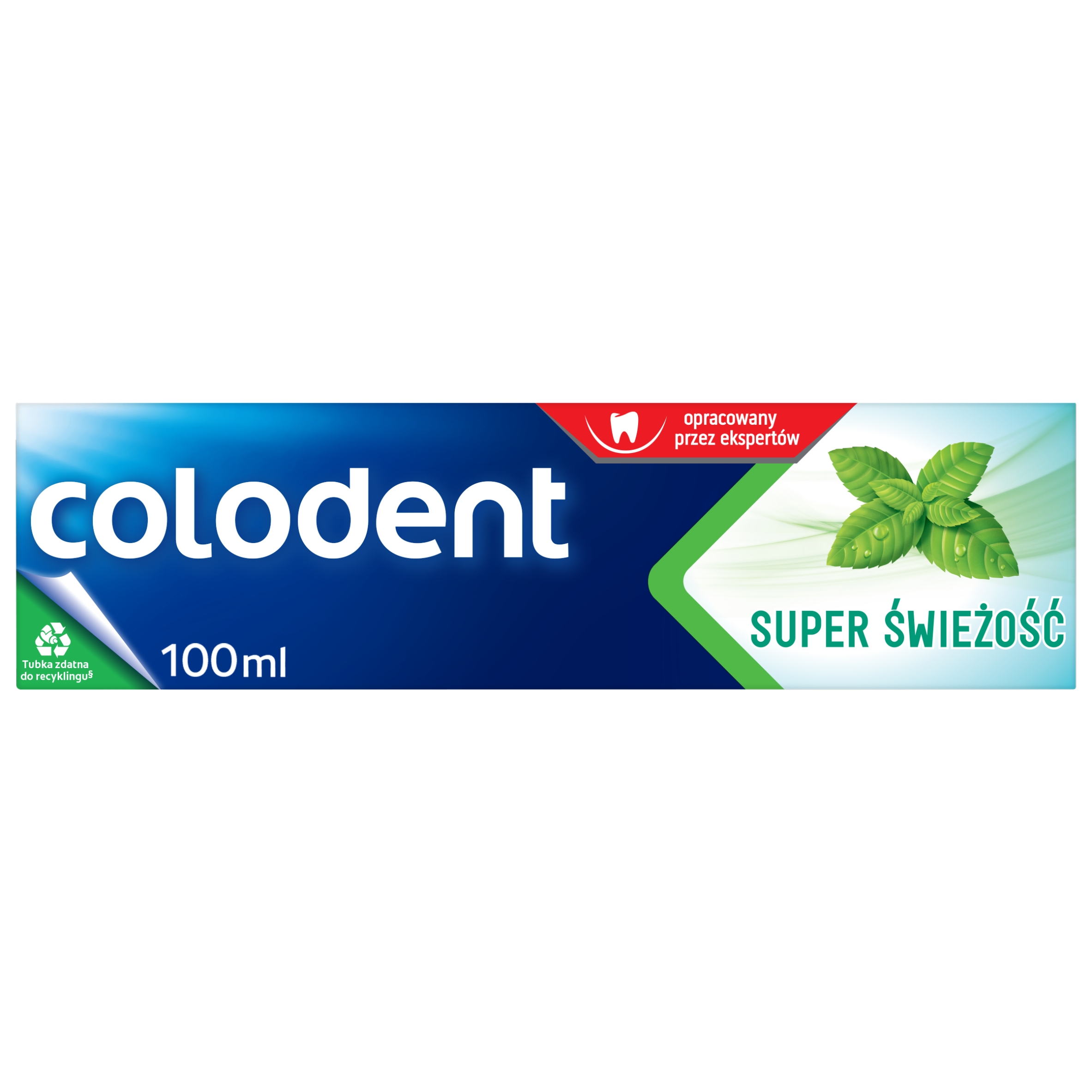 Higiena jamy ustnej jest bardzo ważna. Na szczęście z pastą do zębów Colodent znakomicie doskonale zadbasz o swoje zęby! Produkt stanowi unikalne połączenie białej pasty i zielonego żelu. Dzięki takiej recepturze Colodent Super Świeżość nie tylko czyści zęby i usuwa płytkę nazębną, ale także wzmacnia szkliwo, zapobiega próchnicy oraz pozostawia niesamowicie świeży oddech.