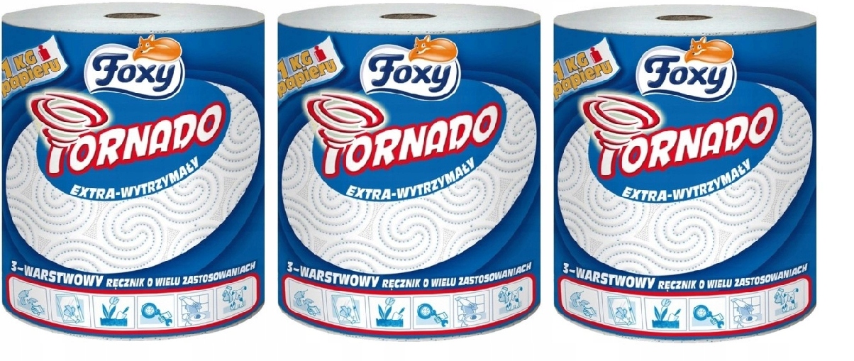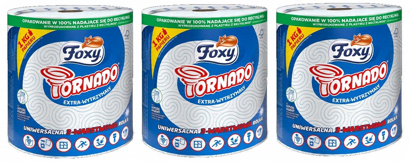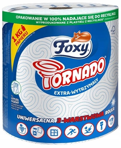 Ręczniki Foxy Tornado pozwolą Ci szybko usunąć nawet najtrudniejsze zabrudzenia, a następnie wytrzeć powierzchnię do sucha, a to wszystko dzięki 3 warstwom chłonnego ręcznika. Wydajne rolki, które starczają na długo. Ręczniki Foxy Tornado są idealne do ścierania plam z podłogi, czyszczenia na mokro, czy usuwania tłuszczu z zabrudzonych powierzchni.